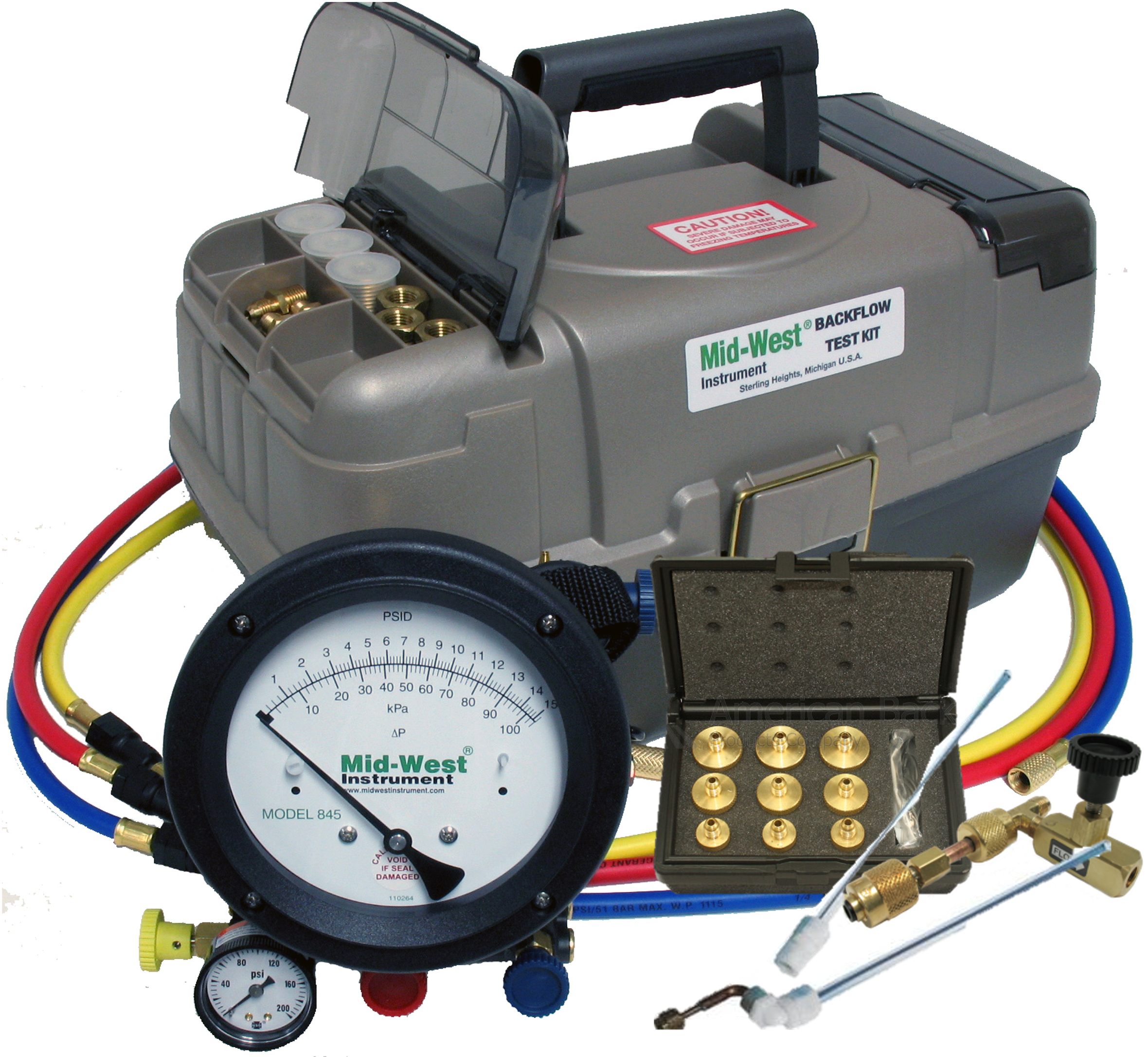 845-5 Mid-West five valve test kit for testing all types and sizes of backflow prevention assemblies. Comes with brass test cock adapter fittings 1/4" - 3/4". Includes one-year certification report required by most local jurisdictions.