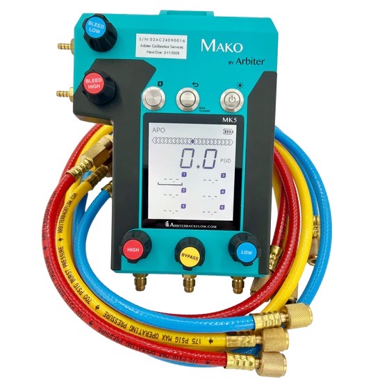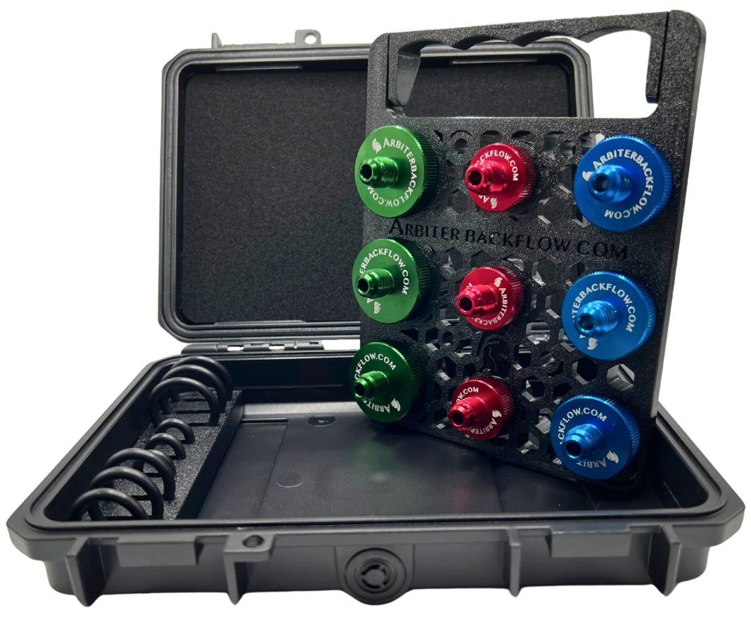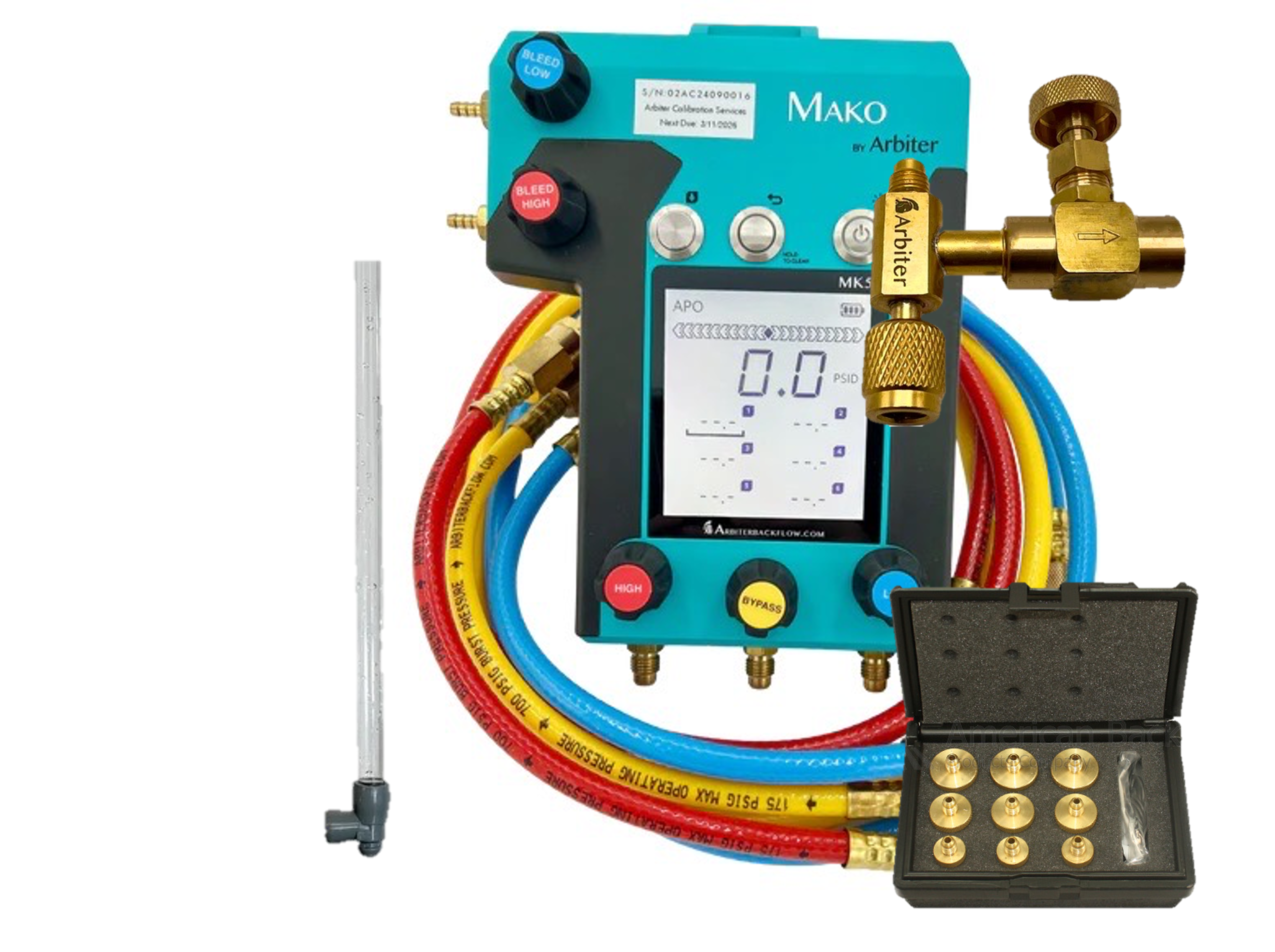 Get all four parts in this bundle for one low price! Includes: Arbiter Mako MK-5 Test Kit, Vertical Sight Tube, Quick Test Fittings (Brass set), and Arbiter Bleed Off Valve. Includes a FREE calibration coupon the following year by sending test kit to American Backflow.